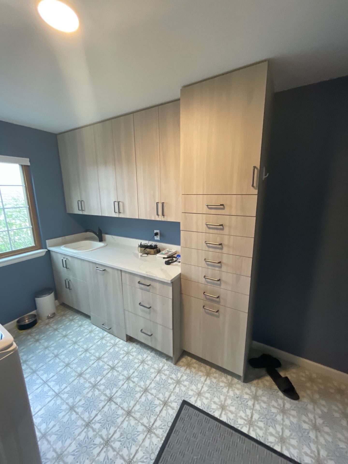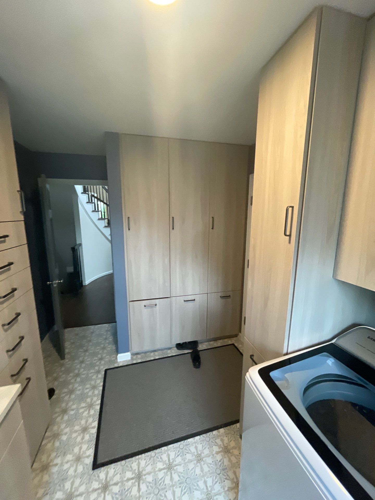 A welcoming entry: With sleek cabinets stretching from floor to ceiling and eye-catching patterned flooring, the finished laundry/mudroom sets the tone for an organized and stylish home environment. Plus, the new fire-rated door improves safety and insulation in that room.